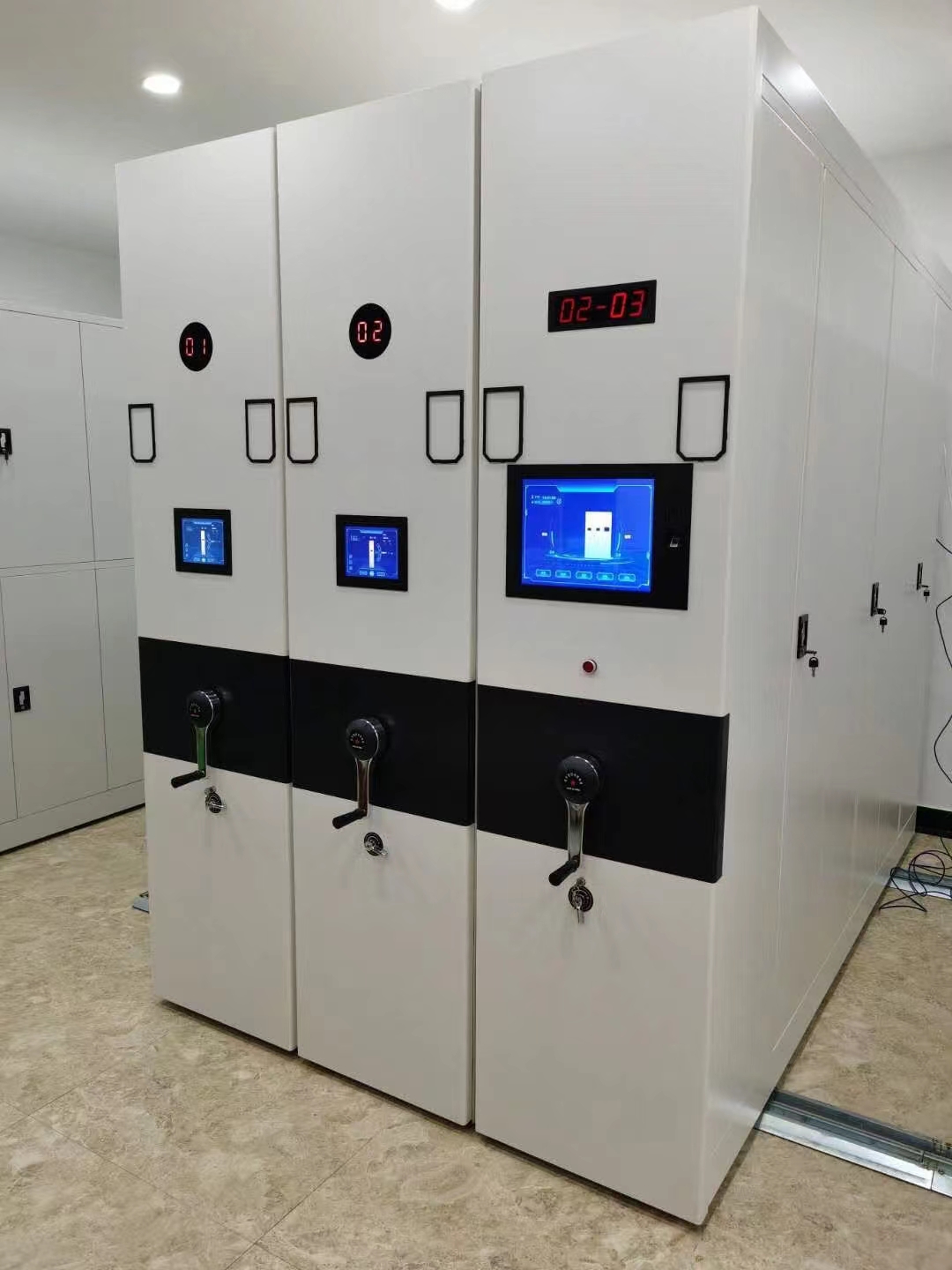 (1)门板:采用≥0.7mm厚优质冷轧钢板,背面点焊加强筋。右上门装有密集架豪华闪电锁,组装后缝隙均匀,锁定紧密,开启灵活。
